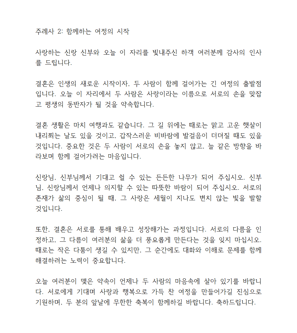 결혼은 인생의 새로운 시작이자, 두 사람이 함께 걸어가는 긴 여정의 출발점입니다. 오늘 이 자리에서 두 사람은 사랑이라는 이름으로 서로의 손을 맞잡고 평생의 동반자가 될 것을 약속합니다.
