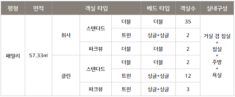 ○ 패밀리 (취사, 클린) : 총 56실 / 정원 4인 (최대 6인)