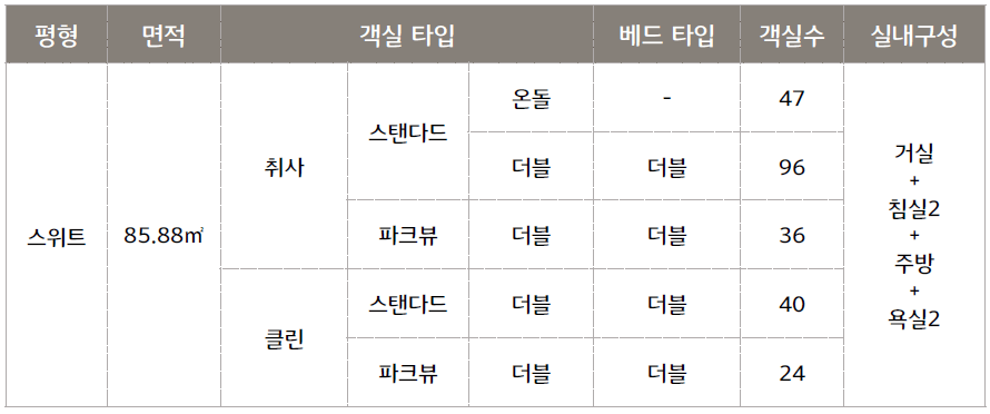 ○ 스위트 (취사, 클린) : 총 243실 / 정원 5인 (최대 8인)