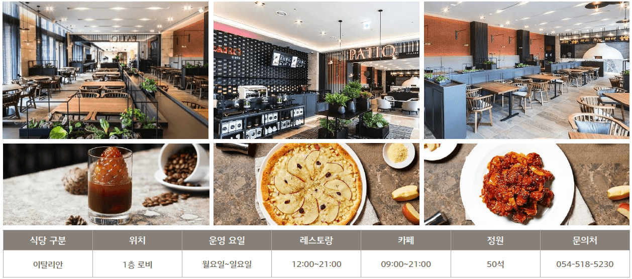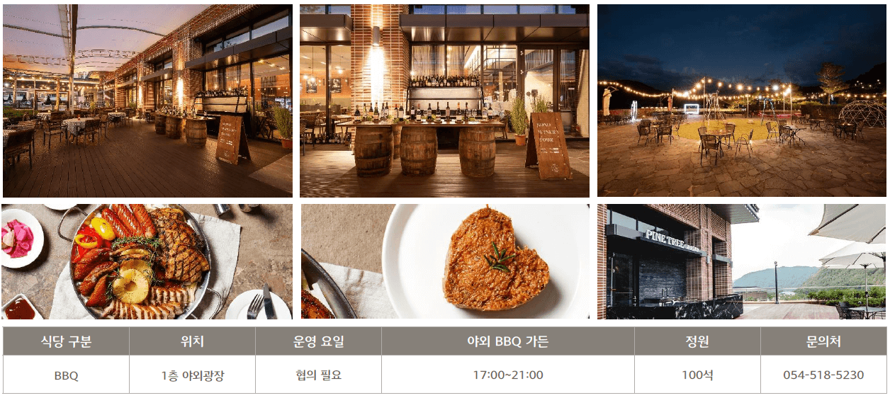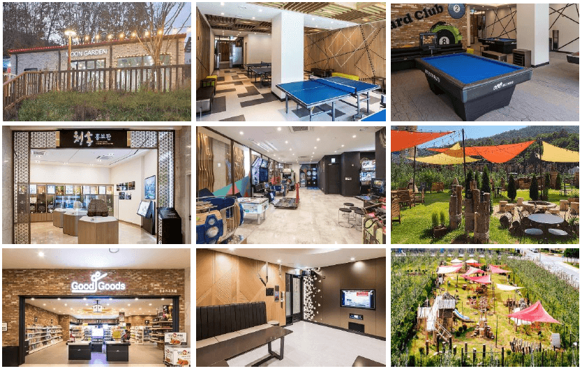 ○ 부대시설 : 식음업장(수달래, 빠띠오, 파인트리 가든, 불멍 인 애플팜) / 솔샘온천 / 노래방, 탁구장, 당구장, 오락실 등