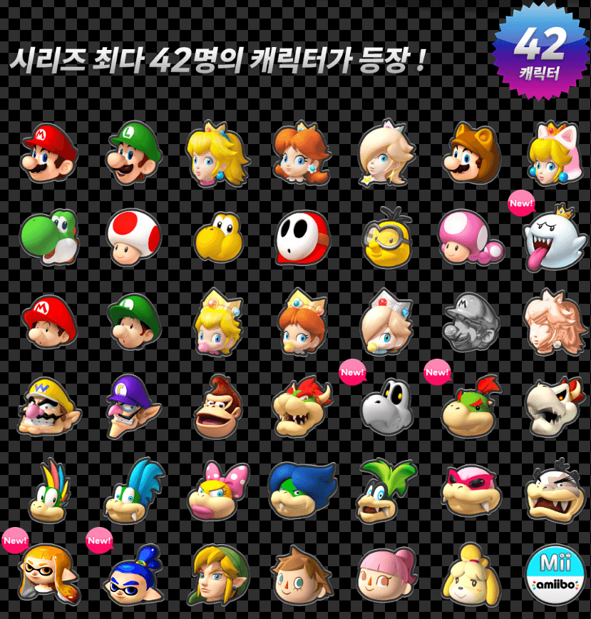 총 42명의 플레이어블 캐릭터: 마리오, 루이지, 피치, 쿠파 등 기존 캐릭터는 물론 잉클링 걸, 잉클링 보이, 링크 등 다양한 게스트 캐릭터 등장.