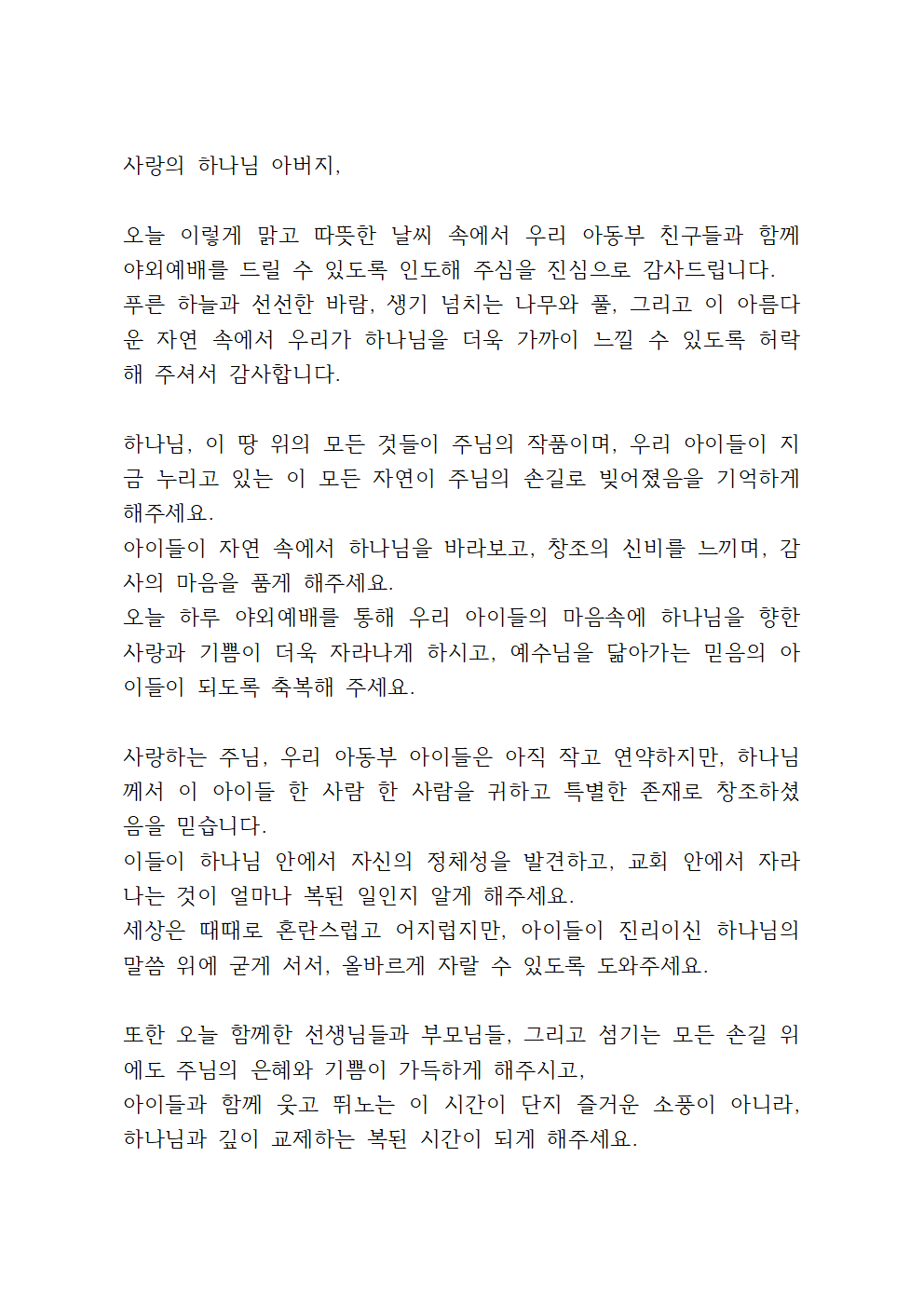 아동부 야외예배 기도 시에는 아이들의 눈높이에 맞추되, 교사로서의 간절한 마음과 신앙적 메시지를 함께 담으면 좋을 것입니다.
