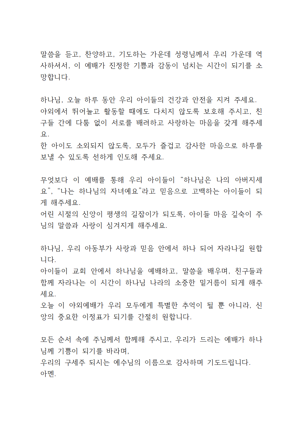 오늘 하루 야외예배를 통해 우리 아이들의 마음속에 하나님을 향한 사랑과 기쁨이 더욱 자라나게 하시고, 예수님을 닮아가는 믿음의 아이들이 되도록 축복해 주세요.