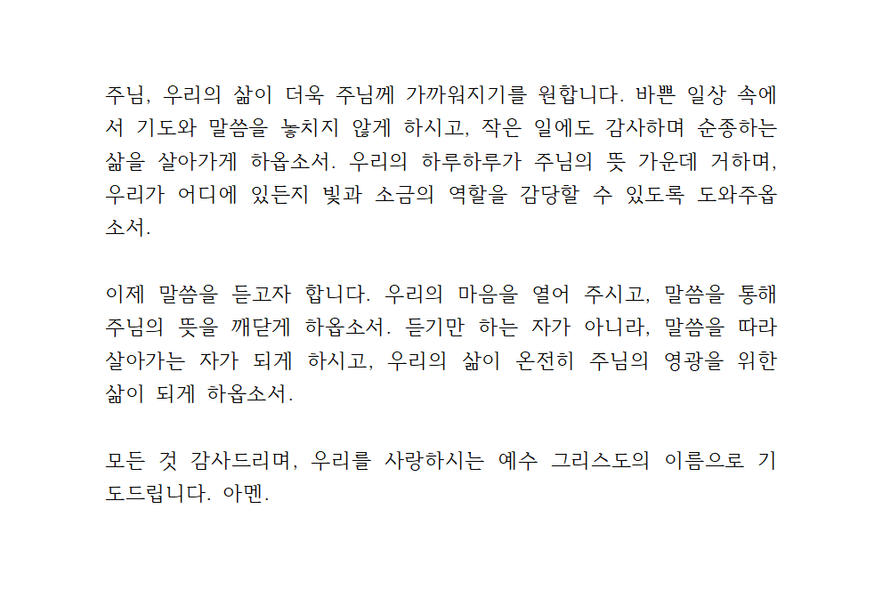 이제 말씀을 듣고자 합니다. 우리의 마음을 열어 주시고, 말씀을 통해 주님의 뜻을 깨닫게 하옵소서. 듣기만 하는 자가 아니라, 말씀을 따라 살아가는 자가 되게 하시고, 우리의 삶이 온전히 주님의 영광을 위한 삶이 되게 하옵소서.