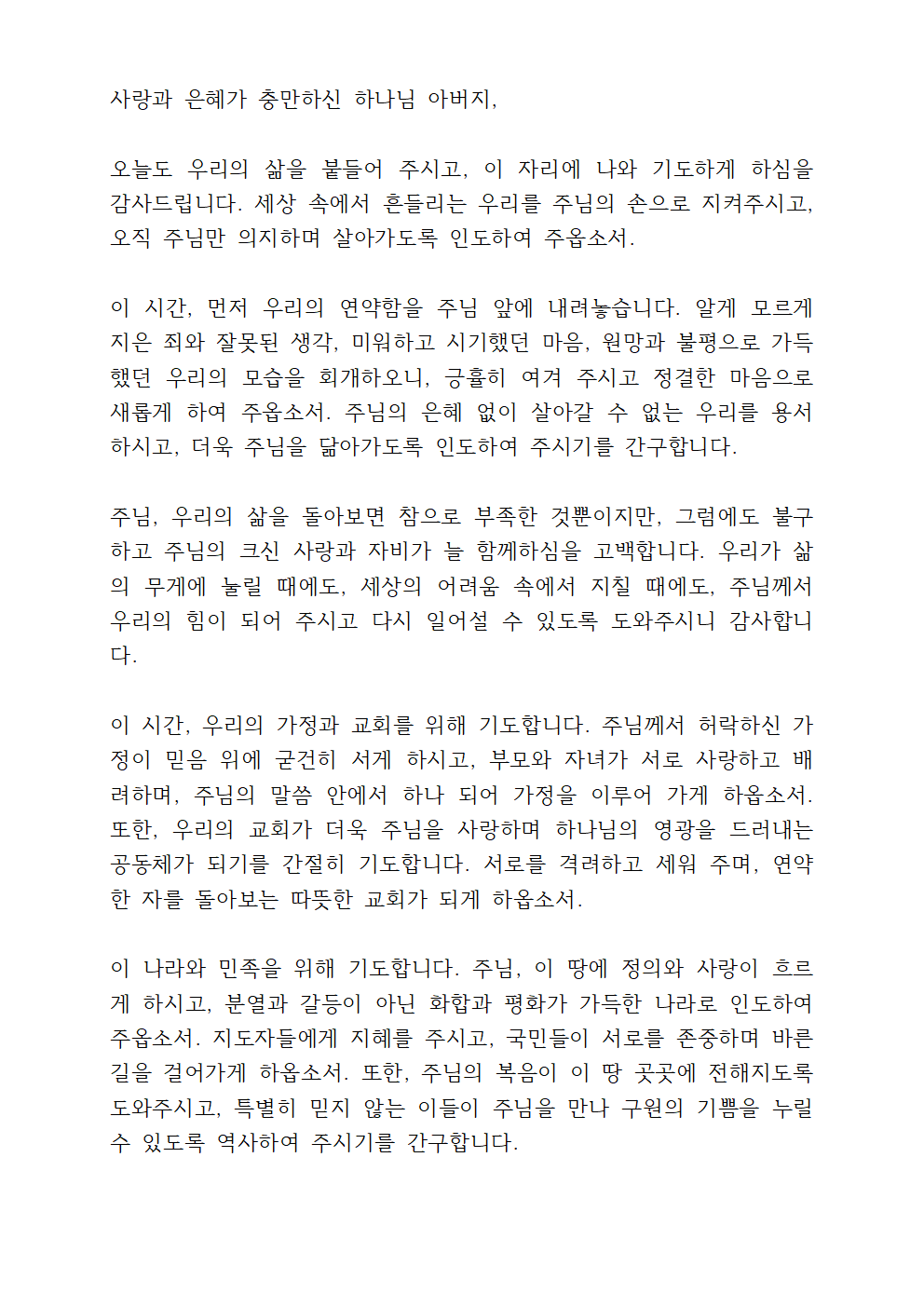 이번 기도문은 하나님의 사랑과 은혜에 감사하며, 공동체가 한마음으로 주님의 뜻을 따라 살아가기를 간구하는 내용으로 구성되었습니다.