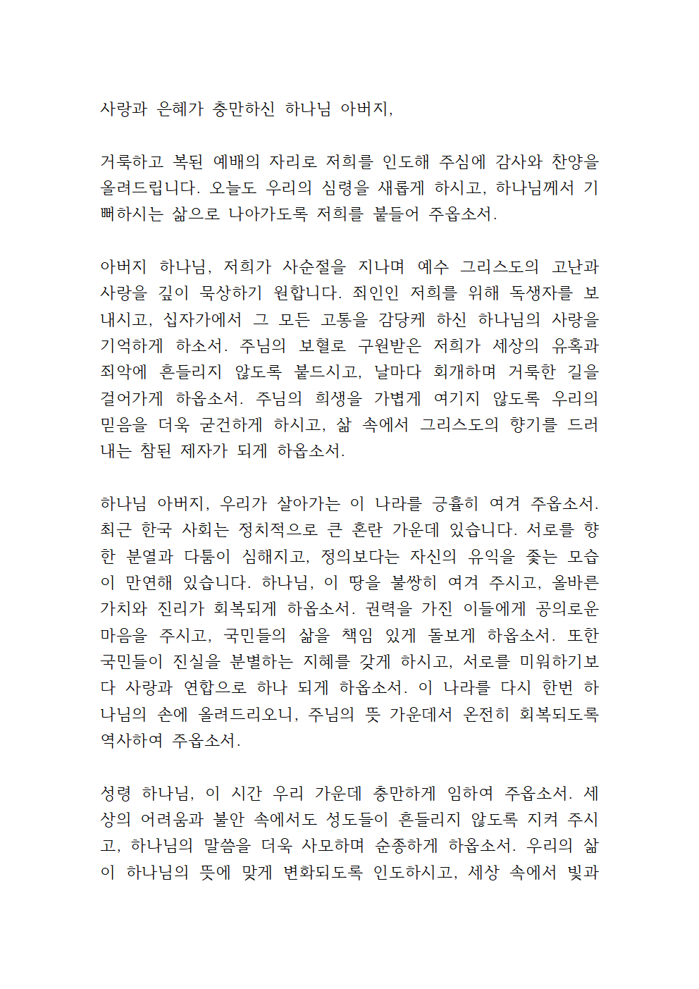 이번 기도문은 사순절을 맞아 우리를 위한 예수 그리스도의 희생을 묵상하며, 정치적으로 혼란스러운 한국 사회에 하나님의 정의와 평화를 간구하고, 성령의 충만함을 통해 교회와 성도들이 흔들림 없이 믿음을 지켜나가도록 기도합니다.