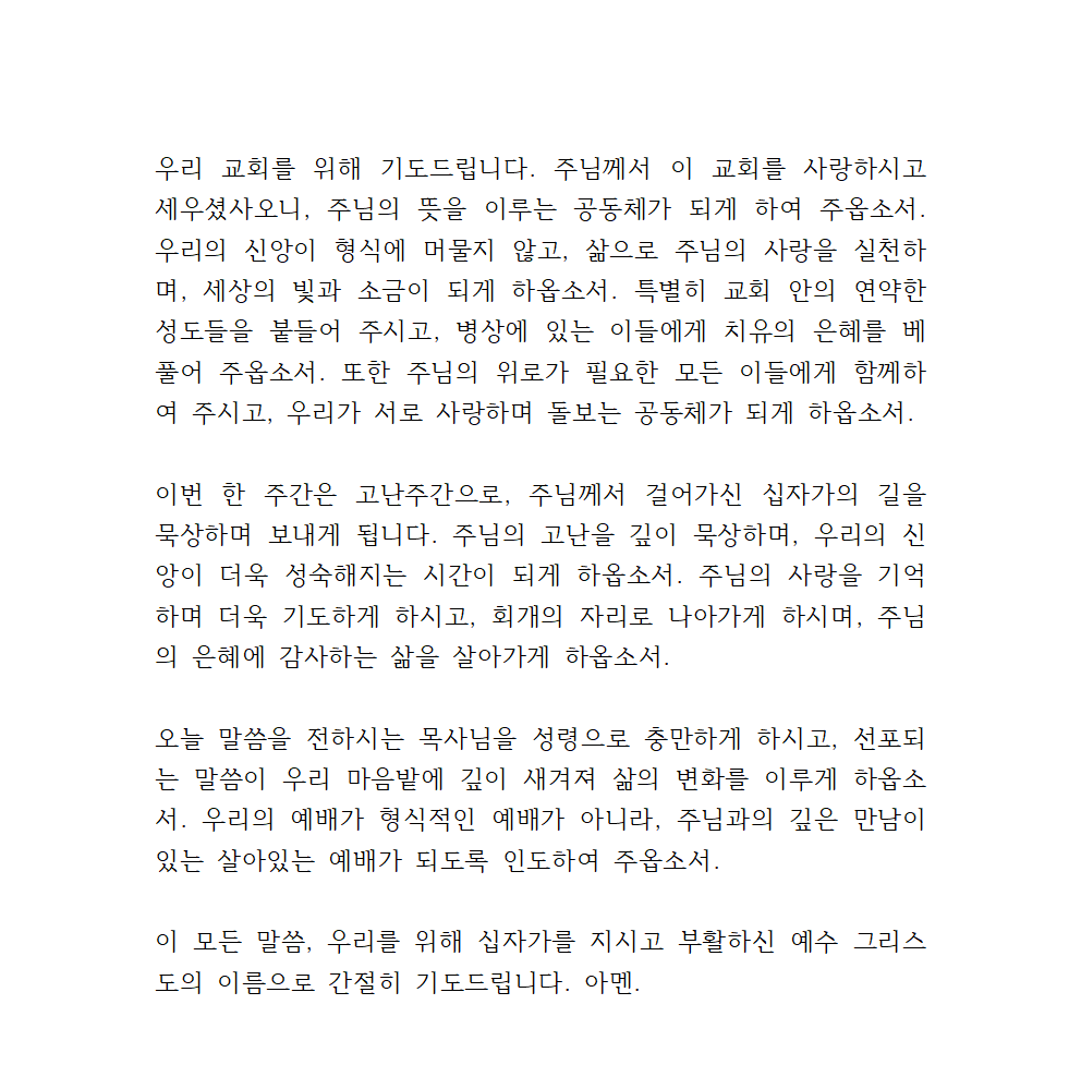 이번 한 주간은 고난주간으로, 주님께서 걸어가신 십자가의 길을 묵상하며 보내게 됩니다. 주님의 고난을 깊이 묵상하며, 우리의 신앙이 더욱 성숙해지는 시간이 되게 하옵소서. 주님의 사랑을 기억하며 더욱 기도하게 하시고, 회개의 자리로 나아가게 하시며, 주님의 은혜에 감사하는 삶을 살아가게 하옵소서.