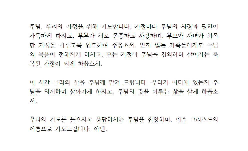 주님, 우리의 가정을 위해 기도합니다. 가정마다 주님의 사랑과 평안이 가득하게 하시고, 부부가 서로 존중하고 사랑하며, 부모와 자녀가 화목한 가정을 이루도록 인도하여 주옵소서. 믿지 않는 가족들에게도 주님의 복음이 전해지게 하시고, 모든 가정이 주님을 경외하며 살아가는 축복된 가정이 되게 하옵소서.