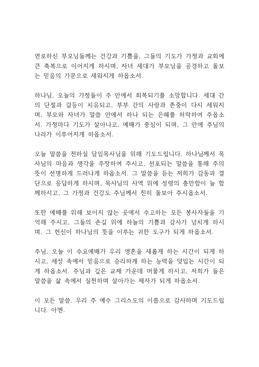 주님, 오늘 이 수요예배가 우리 영혼을 새롭게 하는 시간이 되게 하시고, 세상 속에서 믿음으로 승리하게 하는 능력을 덧입는 시간이 되게 하옵소서. 주님과 깊은 교제 가운데 머물게 하시고, 저희가 들은 말씀을 삶 속에서 실천하며 살아가는 제자가 되게 하옵소서.