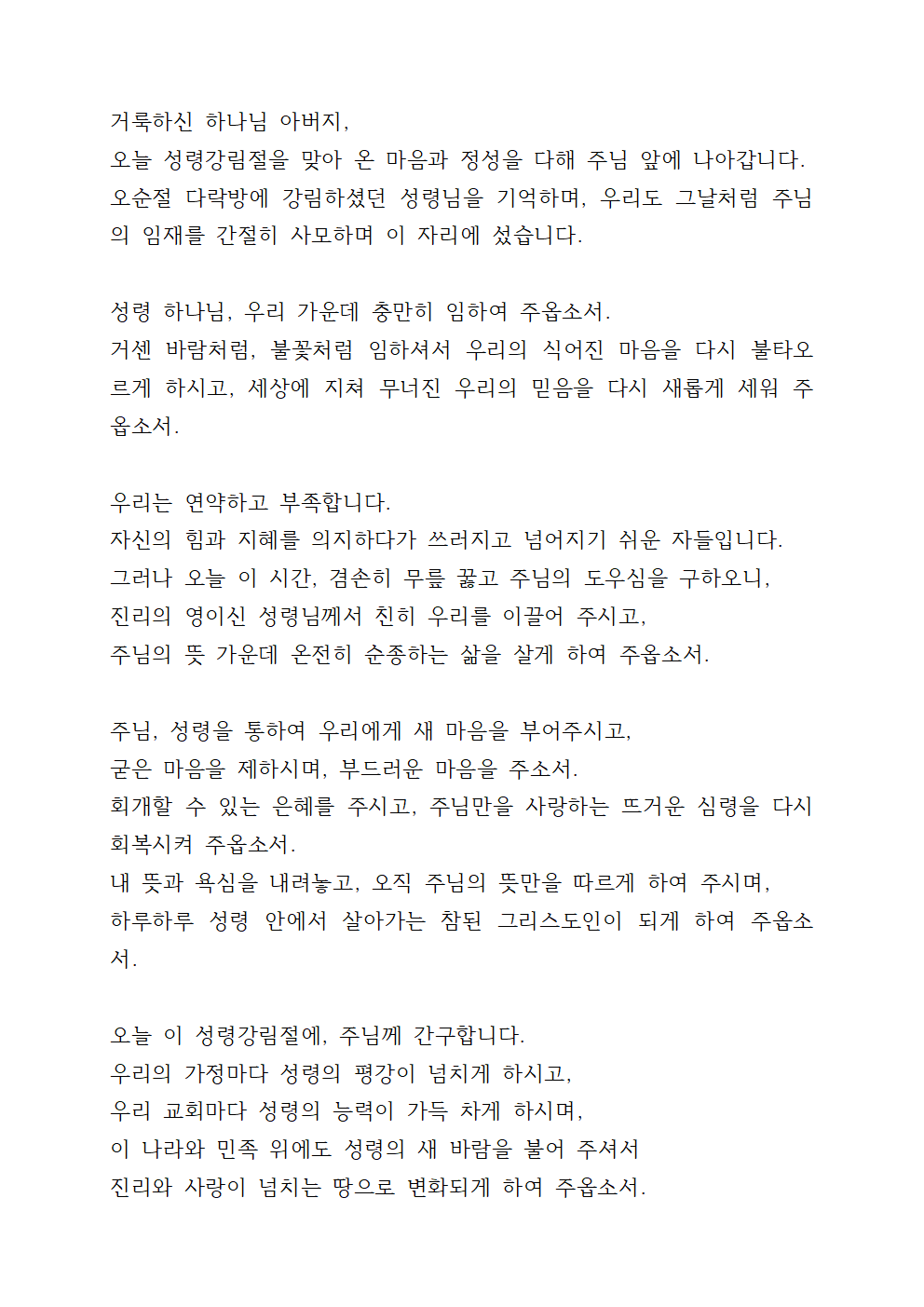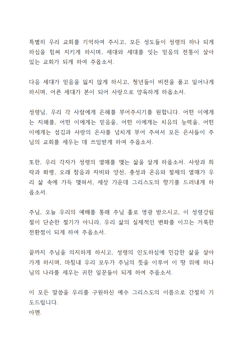 특별히 오늘은 성령강림주일로 지킵니다. 오순절 마가의 다락방에 불과 같은 성령이 임하셨던 그 날처럼, 오늘 이 시간에도 우리의 심령 위에 성령의 충만함이 임하게 하시고, 성령의 열매가 우리의 삶 가운데 나타나게 하여 주옵소서. 우리 교회와 성도들의 심령이 메마르지 않게 하시고, 말씀 위에 굳게 서서 성령의 능력으로 세상 가운데 예수 그리스도를 증거하는 삶을 살아가게 하소서.