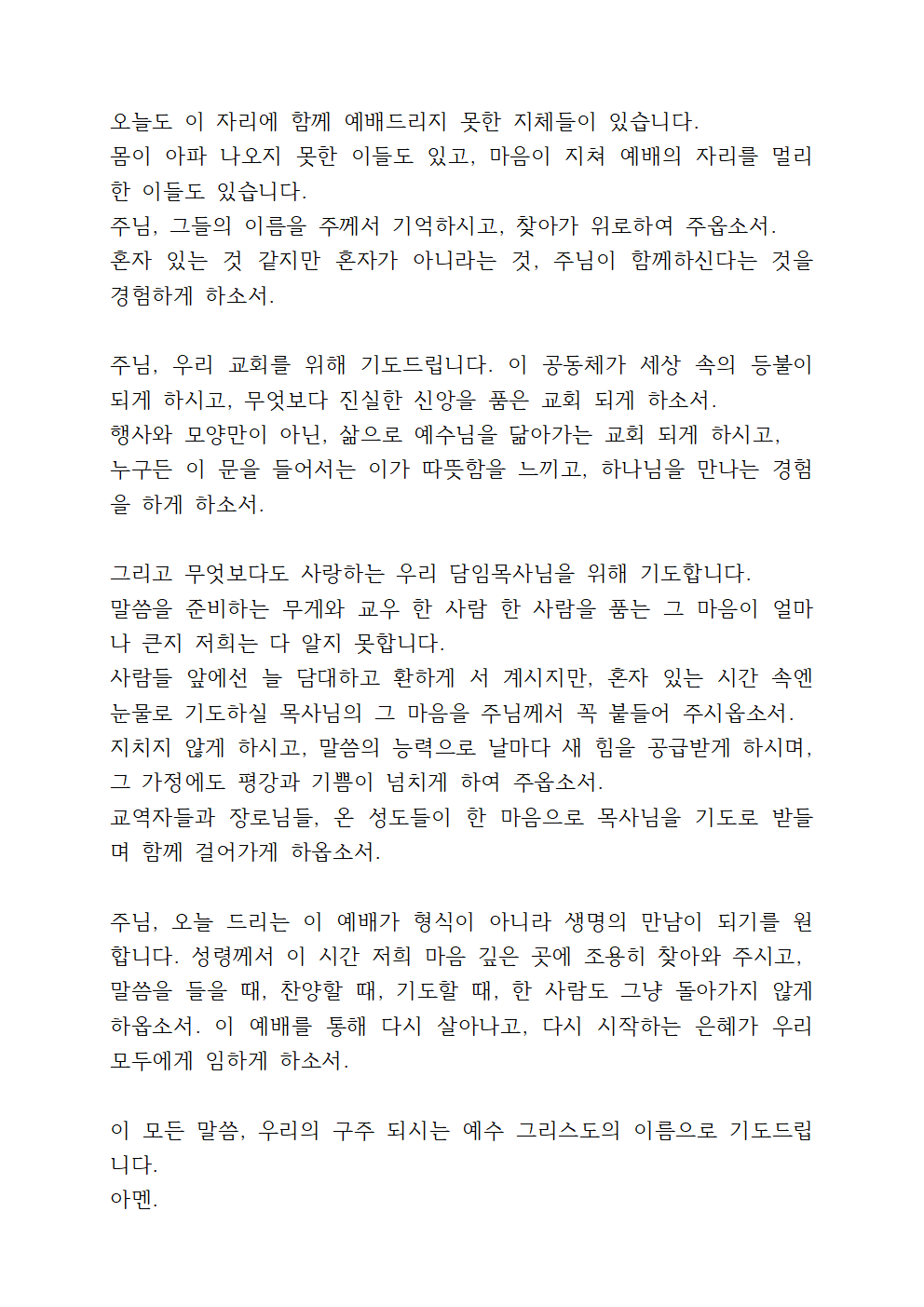 모든 순서 위에 주님의 은혜로 함께해 주시고, 예배를 통하여 우리의 믿음이 더욱 견고해지며, 한 주간을 승리하며 살아갈 힘을 얻게 하소서.