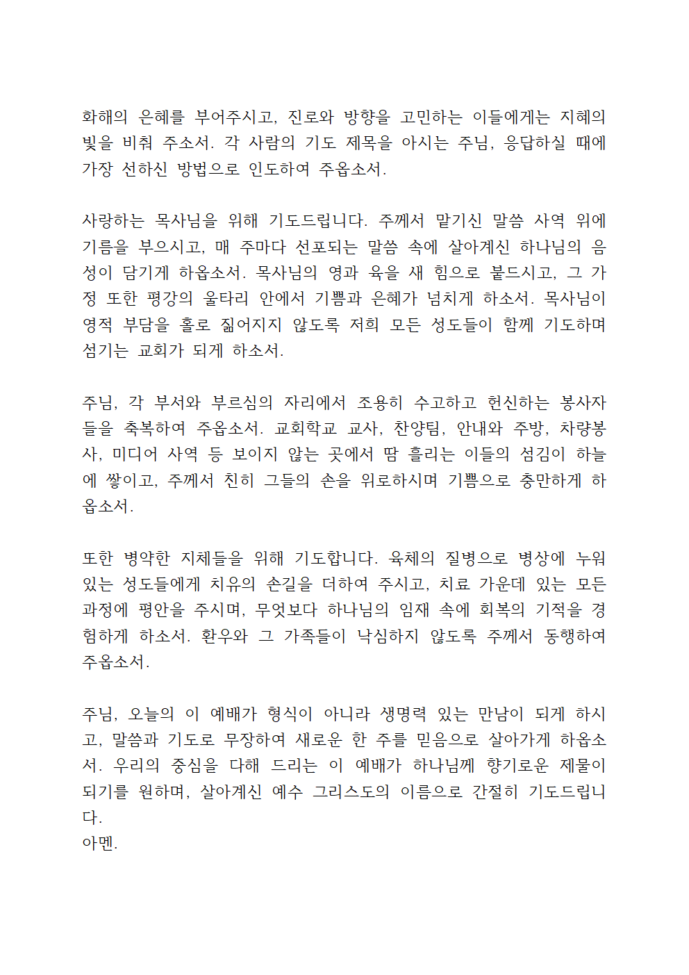 사랑하는 목사님을 위해 기도드립니다. 주께서 맡기신 말씀 사역 위에 기름을 부으시고, 매 주마다 선포되는 말씀 속에 살아계신 하나님의 음성이 담기게 하옵소서. 목사님의 영과 육을 새 힘으로 붙드시고, 그 가정 또한 평강의 울타리 안에서 기쁨과 은혜가 넘치게 하소서. 목사님이 영적 부담을 홀로 짊어지지 않도록 저희 모든 성도들이 함께 기도하며 섬기는 교회가 되게 하소서.