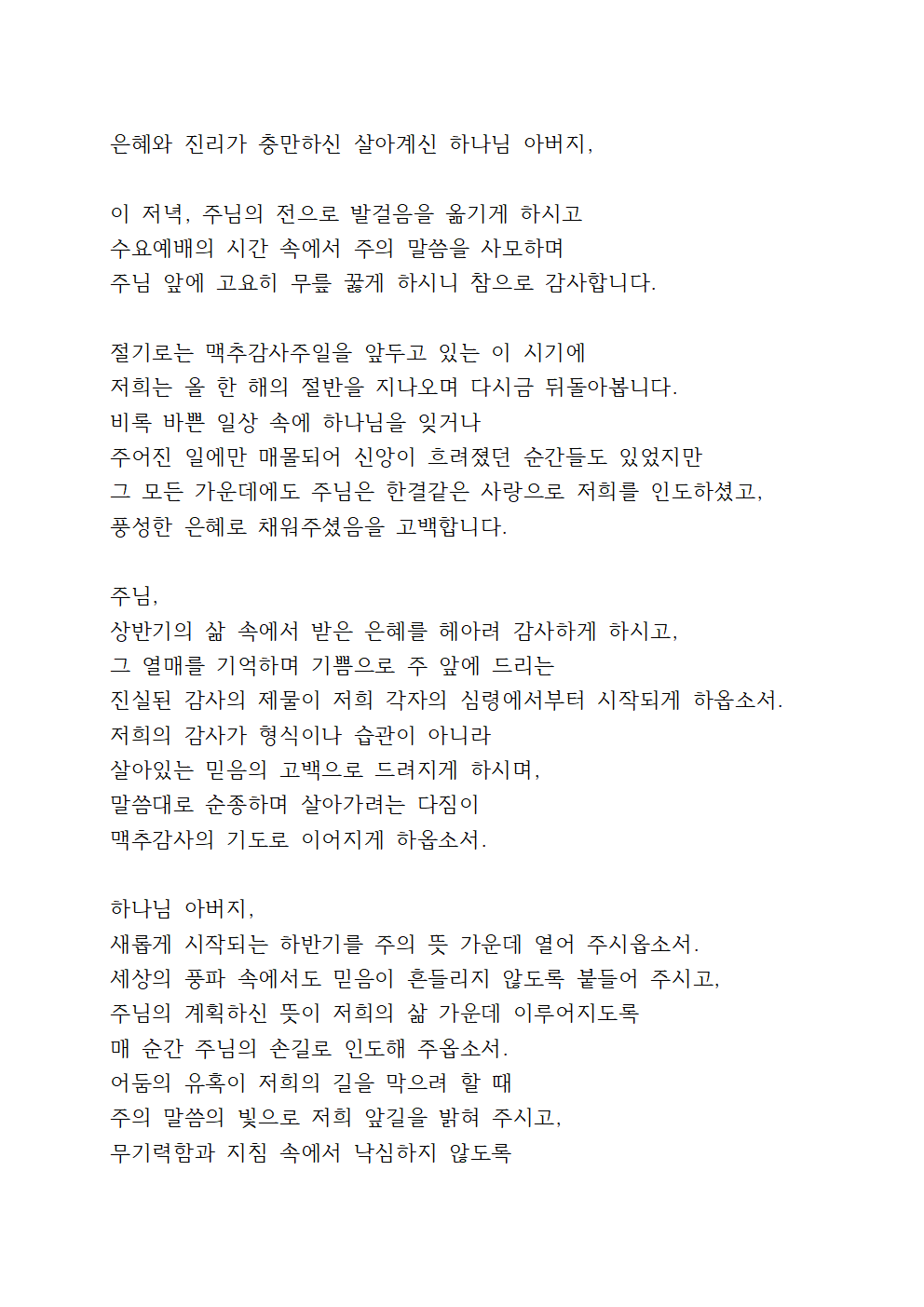 그리고 맥추감사주일을 앞두고 우리의 일상과 신앙을 돌아보며, 더 깊은 헌신과 순종을 다짐하는 기도이면 좋겠습니다.