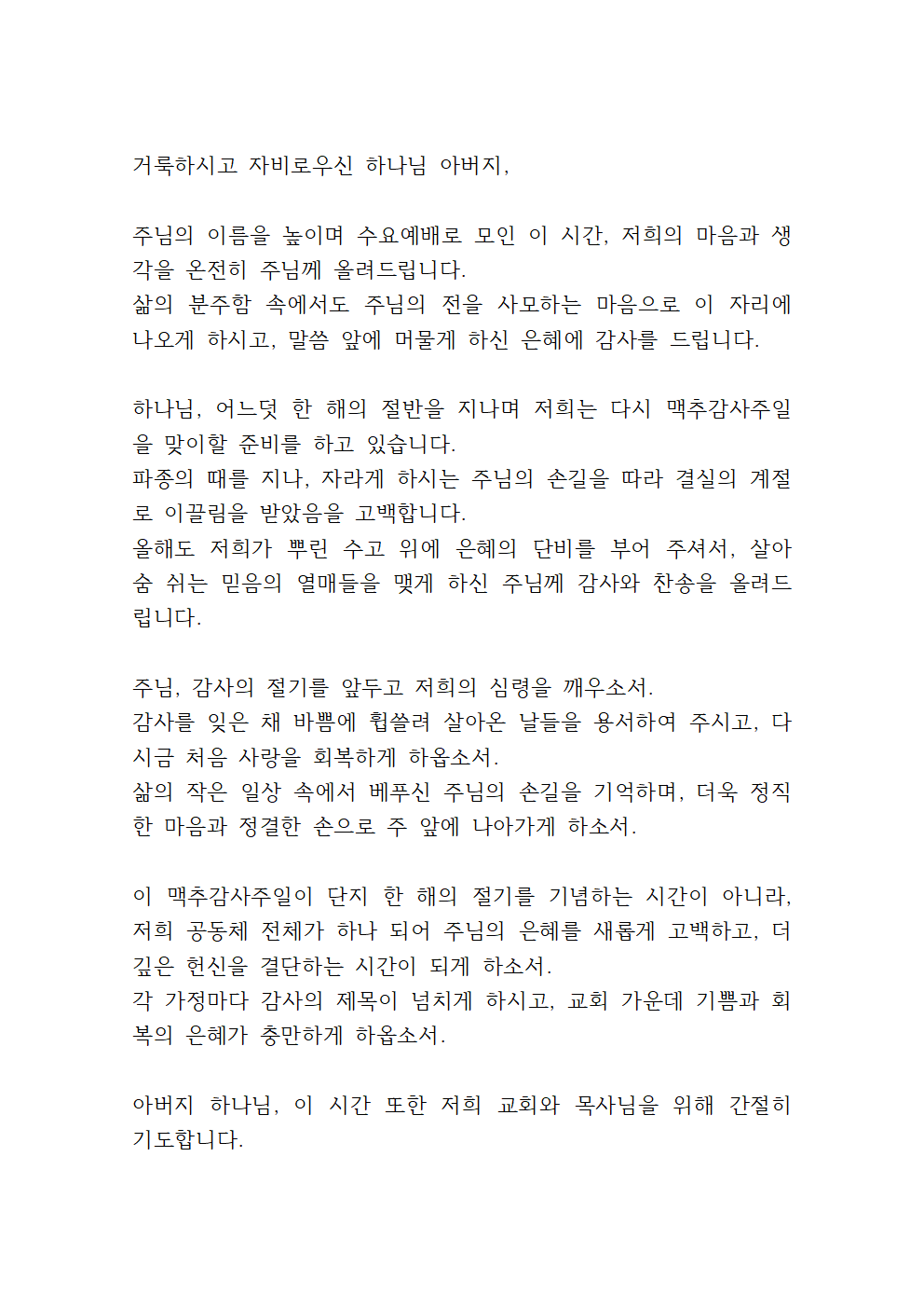 주님, 감사의 절기를 앞두고 저희의 심령을 깨우소서. 감사를 잊은 채 바쁨에 휩쓸려 살아온 날들을 용서하여 주시고, 다시금 처음 사랑을 회복하게 하옵소서. 삶의 작은 일상 속에서 베푸신 주님의 손길을 기억하며, 더욱 정직한 마음과 정결한 손으로 주 앞에 나아가게 하소서.